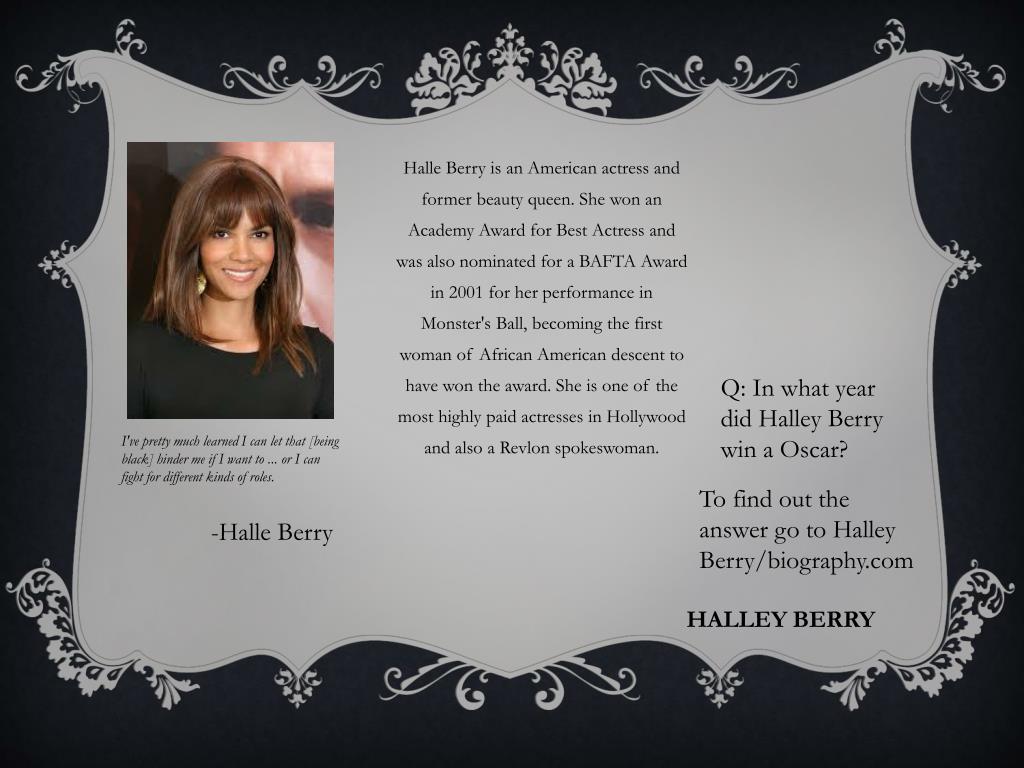 Halley berry Halle Berry is an American actress and former beauty queen. She won an Academy Award for Best Actress and was also nominated for a BAFTA Award in 2001 for her performance in Monster's Ball, becoming the first woman of African American descent to have won the award. She is one of the most highly paid actresses in Hollywood and also a Revlon spokeswoman. Q: In what year did Halley Berry win a Oscar? I've pretty much learned I can let that [being black] hinder me if I want to ... or I can fight for different kinds of roles. -Halle Berry To find out the answer go to Halley Berry/biography.com