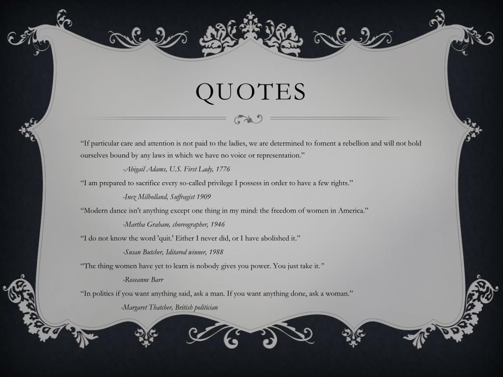 quotes “If particular care and attention is not paid to the ladies, we are determined to foment a rebellion and will not hold ourselves bound by any laws in which we have no voice or representation.” -Abigail Adams, U.S. First Lady, 1776 “I am prepared to sacrifice every so-called privilege I possess in order to have a few rights.” -Inez Milholland, Suffragist 1909 “Modern dance isn't anything except one thing in my mind: the freedom of women in America.” -Martha Graham, choreographer, 1946 “I do not know the word 'quit.' Either I never did, or I have abolished it.” -Susan Butcher, Iditarod winner, 1988 “The thing women have yet to learn is nobody gives you power. You just take it.” -Roseanne Barr “In politics if you want anything said, ask a man. If you want anything done, ask a woman.” -Margaret Thatcher, British politician