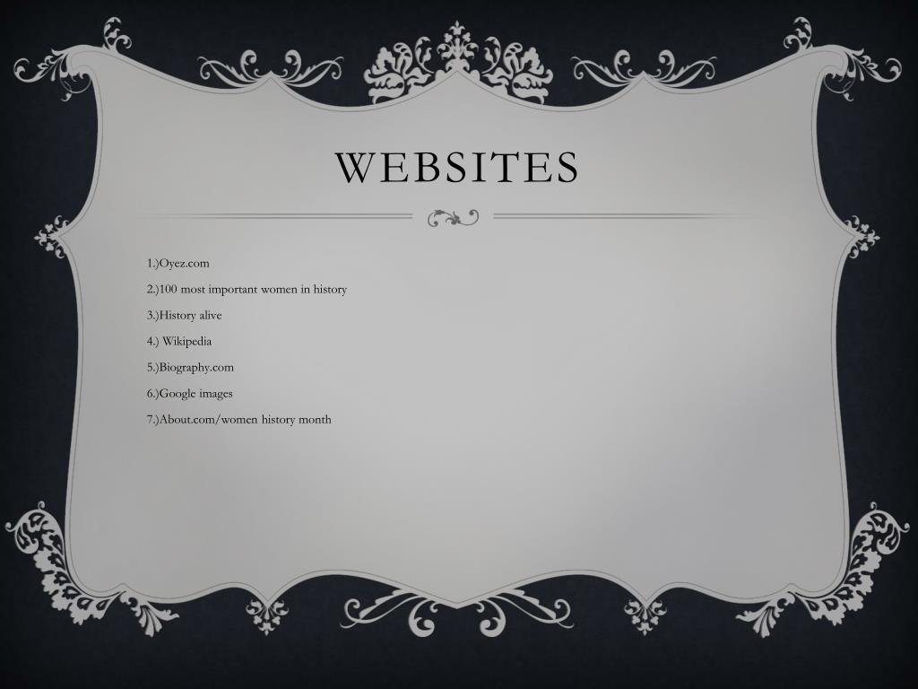 Websites 1.)Oyez.com 2.)100 most important women in history 3.)History alive 4.) Wikipedia 5.)Biography.com 6.)Google images 7.)About.com/women history month