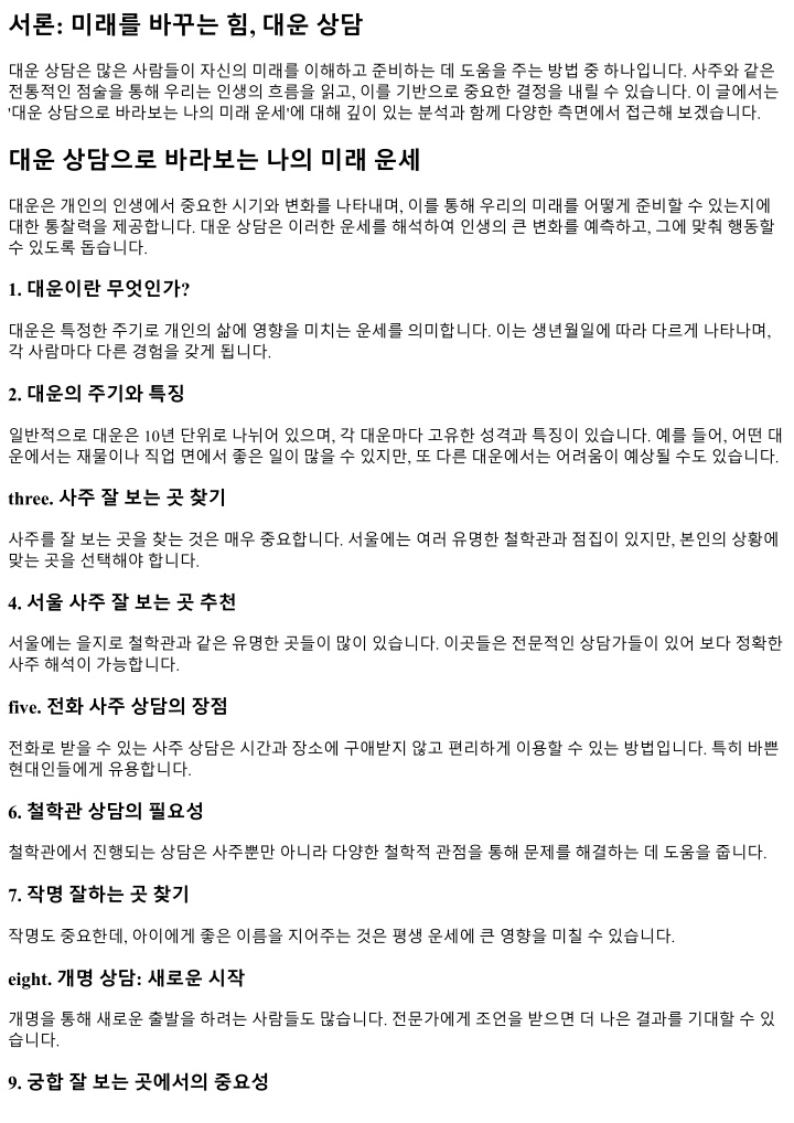 서론: 미래를바꾸는힘, 대운상담 대운상담은많은사람들이자신의미래를이해하고준비하는데도움을주는방법중하나입니다. 사주와같은 전통적인점술을통해우리는인생의흐름을읽고, 이를기반으로중요한결정을내릴수있습니다. 이글에서는 '대운상담으로바라보는나의미래운세'에대해깊이있는분석과함께다양한측면에서접근해보겠습니다. 대운상담으로바라보는나의미래운세 대운은개인의인생에서중요한시기와변화를나타내며, 이를통해우리의미래를어떻게준비할수있는지에 대한통찰력을제공합니다. 대운상담은이러한운세를해석하여인생의큰변화를예측하고, 그에맞춰행동할 수있도록돕습니다. 1. 대운이란무엇인가? 대운은특정한주기로개인의삶에영향을미치는운세를의미합니다. 이는생년월일에따라다르게나타나며, 각사람마다다른경험을갖게됩니다. 2. 대운의주기와특징 일반적으로대운은 10년단위로나뉘어있으며, 각대운마다고유한성격과특징이있습니다. 예를들어, 어떤대 운에서는재물이나직업면에서좋은일이많을수있지만, 또다른대운에서는어려움이예상될수도있습니다. three. 사주잘보는곳찾기 사주를잘보는곳을찾는것은매우중요합니다. 서울에는여러유명한철학관과점집이있지만, 본인의상황에 맞는곳을선택해야합니다. 4. 서울사주잘보는곳추천 서울에는을지로철학관과같은유명한곳들이많이있습니다. 이곳들은전문적인상담가들이있어보다정확한 사주해석이가능합니다. five. 전화사주상담의장점 전화로받을수있는사주상담은시간과장소에구애받지않고편리하게이용할수있는방법입니다. 특히바쁜 현대인들에게유용합니다. 6. 철학관상담의필요성 철학관에서진행되는상담은사주뿐만아니라다양한철학적관점을통해문제를해결하는데도움을줍니다. 7. 작명잘하는곳찾기 작명도중요한데, 아이에게좋은이름을지어주는것은평생운세에큰영향을미칠수있습니다. eight. 개명상담: 새로운시작 개명을통해새로운출발을하려는사람들도많습니다. 전문가에게조언을받으면더나은결과를기대할수있 습니다. 9. 궁합잘보는곳에서의중요성