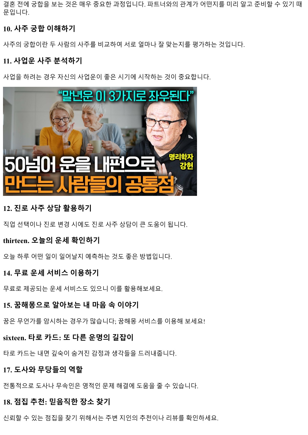 결혼전에궁합을보는것은매우중요한과정입니다. 파트너와의관계가어떤지를미리알고준비할수있기때 문입니다. 10. 사주궁합이해하기 사주의궁합이란두사람의사주를비교하여서로얼마나잘맞는지를평가하는것입니다. 11. 사업운사주분석하기 사업을하려는경우자신의사업운이좋은시기에시작하는것이중요합니다. 12. 진로사주상담활용하기 직업선택이나진로변경시에도진로사주상담이큰도움이됩니다. thirteen. 오늘의운세확인하기 오늘하루어떤일이일어날지예측하는것도좋은방법입니다. 14. 무료운세서비스이용하기 무료로제공되는운세서비스도있으니이를활용해보세요. 15. 꿈해몽으로알아보는내마음속이야기 꿈은무언가를암시하는경우가많습니다; 꿈해몽서비스를이용해보세요! sixteen. 타로카드: 또다른운명의길잡이 타로카드는내면깊숙이숨겨진감정과생각들을드러내줍니다. 17. 도사와무당들의역할 전통적으로도사나무속인은영적인문제해결에도움을줄수있습니다. 18. 점집추천: 믿음직한장소찾기 신뢰할수있는점집을찾기위해서는주변지인의추천이나리뷰를확인하세요.