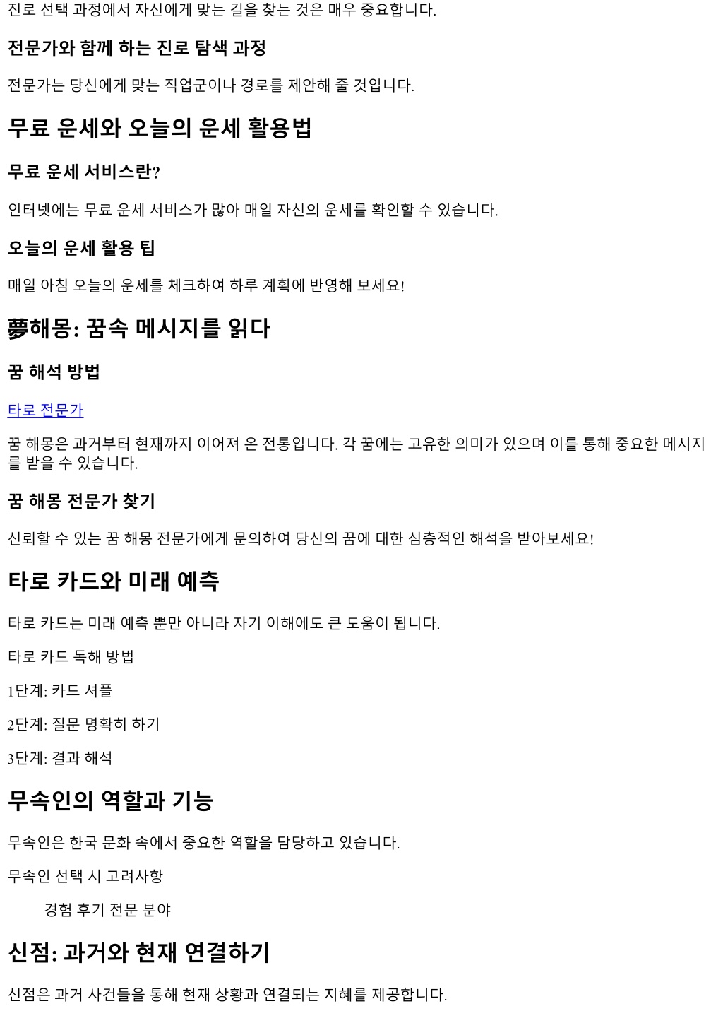 진로선택과정에서자신에게맞는길을찾는것은매우중요합니다.진로선택과정에서자신에게맞는길을찾는것은매우중요합니다. 전문가와함께하는진로탐색과정 전문가는당신에게맞는직업군이나경로를제안해줄것입니다. 무료운세와오늘의운세활용법 무료운세서비스란? 인터넷에는무료운세서비스가많아매일자신의운세를확인할수있습니다. 오늘의운세활용팁 매일아침오늘의운세를체크하여하루계획에반영해보세요! 夢해몽: 꿈속메시지를읽다 꿈해석방법 타로전문가 꿈해몽은과거부터현재까지이어져온전통입니다. 각꿈에는고유한의미가있으며이를통해중요한메시지 를받을수있습니다. 꿈해몽전문가찾기 신뢰할수있는꿈해몽전문가에게문의하여당신의꿈에대한심층적인해석을받아보세요! 타로카드와미래예측 타로카드는미래예측뿐만아니라자기이해에도큰도움이됩니다. 타로카드독해방법 1단계: 카드셔플 2단계: 질문명확히하기 3단계: 결과해석 무속인의역할과기능 무속인은한국문화속에서중요한역할을담당하고있습니다. 무속인선택시고려사항 경험후기전문분야 신점: 과거와현재연결하기 신점은과거사건들을통해현재상황과연결되는지혜를제공합니다.