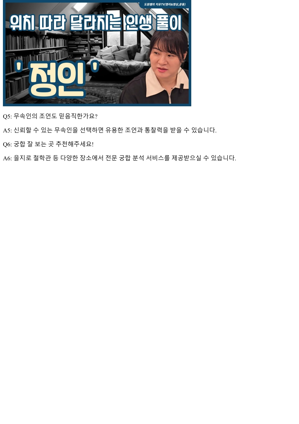 Q5: 무속인의조언도믿음직한가요? A5: 신뢰할수있는무속인을선택하면유용한조언과통찰력을받을수있습니다. Q6: 궁합잘보는곳추천해주세요! A6: 을지로철학관등다양한장소에서전문궁합분석서비스를제공받으실수있습니다.