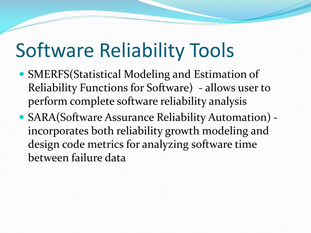 Software Reliability Tools • SMERFS(Statistical Modeling and Estimation of Reliability Functions for Software) - allows user to perform complete software reliability analysis • SARA(Software Assurance Reliability Automation) - incorporates both reliability growth modeling and design code metrics for analyzing software time between failure data