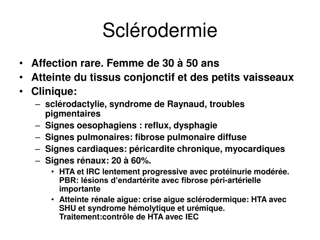 Sclérodermie • Affection rare. Femme de 30 à 50 ans • Atteinte du tissus conjonctif et des petits vaisseaux • Clinique: • sclérodactylie, syndrome de Raynaud, troubles pigmentaires • Signes oesophagiens : reflux, dysphagie • Signes pulmonaires: fibrose pulmonaire diffuse • Signes cardiaques: péricardite chronique, myocardiques • Signes rénaux: 20 à 60%. • HTA et IRC lentement progressive avec protéinurie modérée. PBR: lésions d’endartérite avec fibrose péri-artérielle importante • Atteinte rénale aigue: crise aigue sclérodermique: HTA avec SHU et syndrome hémolytique et urémique. Traitement:contrôle de HTA avec IEC