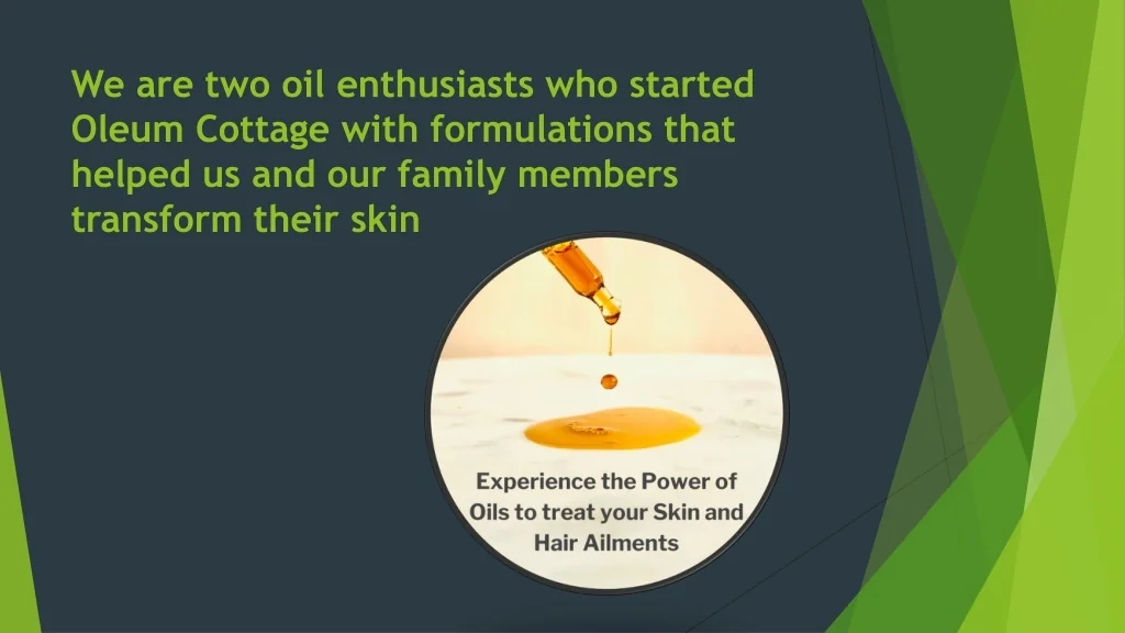 We are two oil enthusiasts who started Oleum Cottage with formulations that helped us and our family members transform their skin