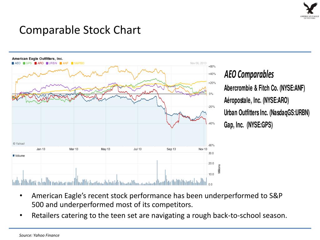 Comparable Stock Chart • American Eagle’s recent stock performance has been underperformed to S&P 500 and underperformed most of its competitors. • Retailers catering to the teen set are navigating a rough back-to-school season. Source: Yahoo Finance