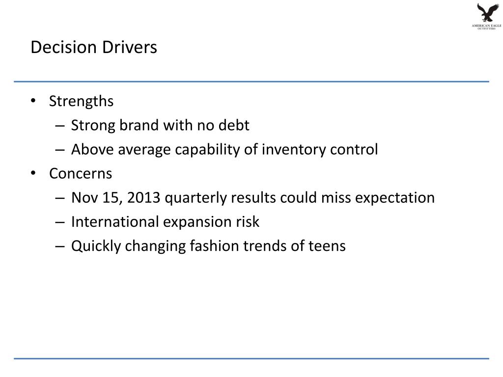 Decision Drivers • Strengths • Strong brand with no debt • Above average capability of inventory control • Concerns • Nov 15, 2013 quarterly results could miss expectation • International expansion risk • Quickly changing fashion trends of teens
