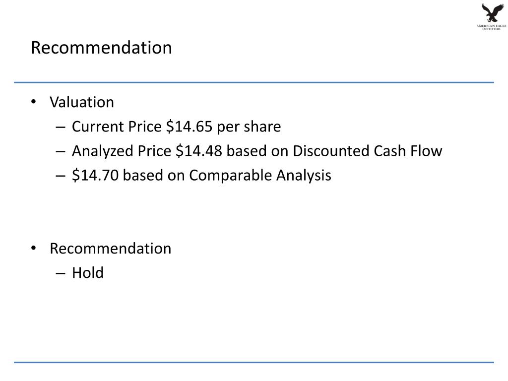 American Eagle Outfitters. Liu Yi Xu Wenqiang (Wayne) Nov 7, 2013. Agenda. Introduction & Holding Review Macroeconomic Factors & Industry Overview Company Overview Management Outlook Financial Analysis Valuation Conclusion & Recommendation.