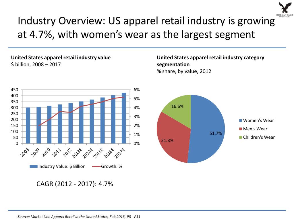 Industry Overview: US apparel retail industry is growing at 4.7%, with women’s wear as the largest segment United States apparel retail industry value $ billion, 2008 – 2017 United States apparel retail industry category segmentation % share, by value, 2012 CAGR (2012 - 2017): 4.7% Source: Market Line Apparel Retail in the United States, Feb 2013, P8 - P11