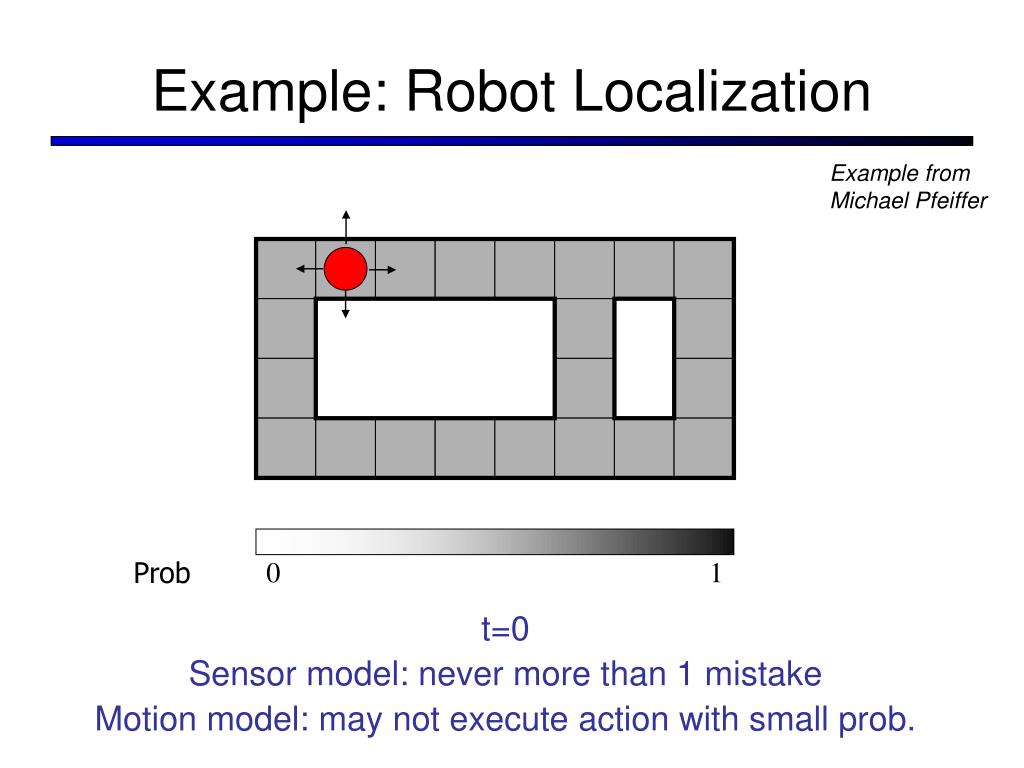 Example: Robot Localization Example from Michael Pfeiffer t=0 Sensor model: never more than 1 mistake Motion model: may not execute action with small prob. Prob 0 1