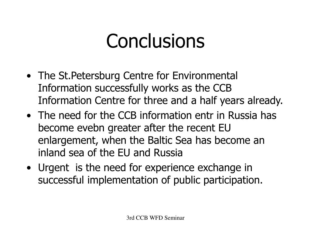 Conclusions • The St.Petersburg Centre for Environmental Information successfully works as the CCB Information Centre for three and a half years already. • The need for the CCB information entr in Russia has become evebn greater after the recent EU enlargement, when the Baltic Sea has become an inland sea of the EU and Russia • Urgent is the need for experience exchange in successful implementation of public participation. 3rd CCB WFD Seminar