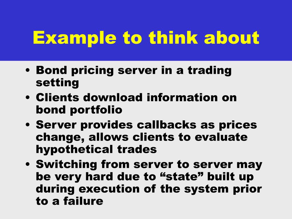 Example to think about • Bond pricing server in a trading setting • Clients download information on bond portfolio • Server provides callbacks as prices change, allows clients to evaluate hypothetical trades • Switching from server to server may be very hard due to “state” built up during execution of the system prior to a failure