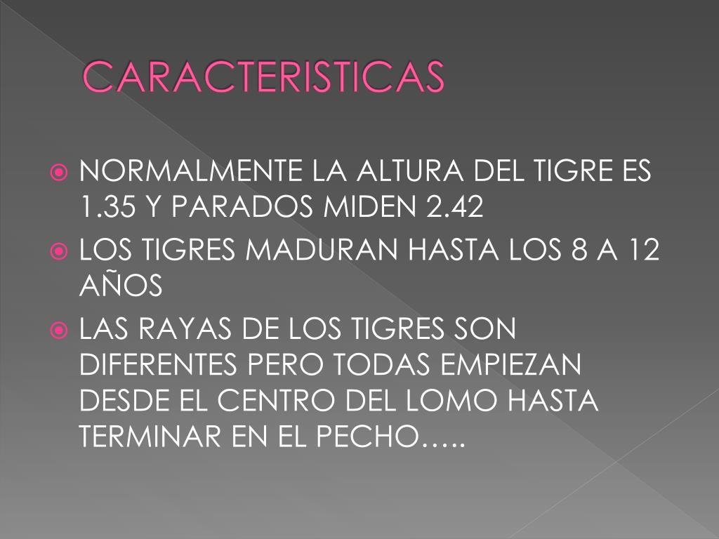 CARACTERISTICAS • NORMALMENTE LA ALTURA DEL TIGRE ES 1.35 Y PARADOS MIDEN 2.42 • LOS TIGRES MADURAN HASTA LOS 8 A 12 AÑOS • LAS RAYAS DE LOS TIGRES SON DIFERENTES PERO TODAS EMPIEZAN DESDE EL CENTRO DEL LOMO HASTA TERMINAR EN EL PECHO…..
