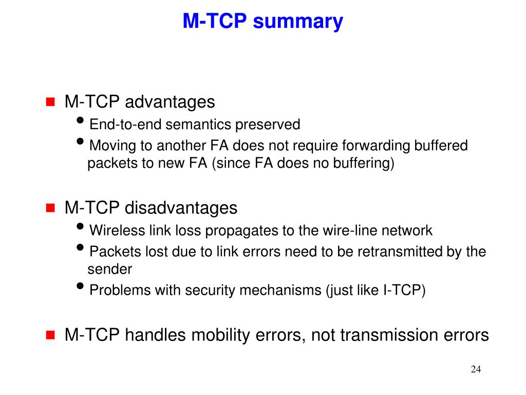 M-TCP summary • M-TCP advantages • End-to-end semantics preserved • Moving to another FA does not require forwarding buffered packets to new FA (since FA does no buffering) • M-TCP disadvantages • Wireless link loss propagates to the wire-line network • Packets lost due to link errors need to be retransmitted by the sender • Problems with security mechanisms (just like I-TCP) • M-TCP handles mobility errors, not transmission errors