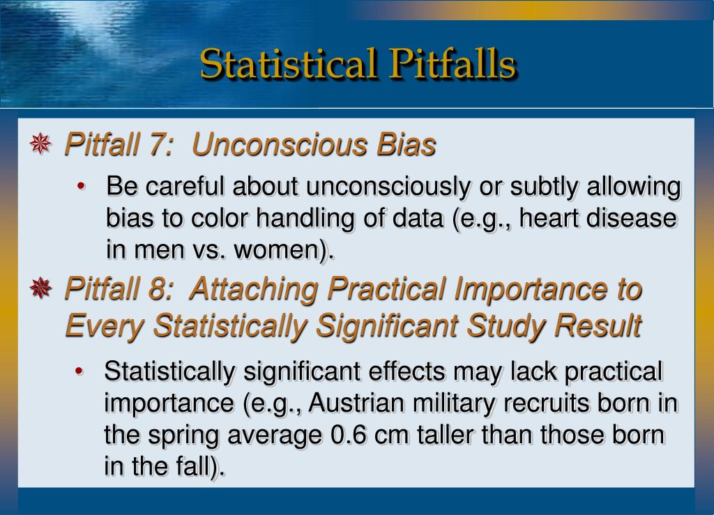 Statistical Pitfalls • Pitfall 7: Unconscious Bias • Pitfall 8: Attaching Practical Importance to Every Statistically Significant Study Result • Be careful about unconsciously or subtly allowing bias to color handling of data (e.g., heart disease in men vs. women). • Statistically significant effects may lack practical importance (e.g., Austrian military recruits born in the spring average 0.6 cm taller than those born in the fall).