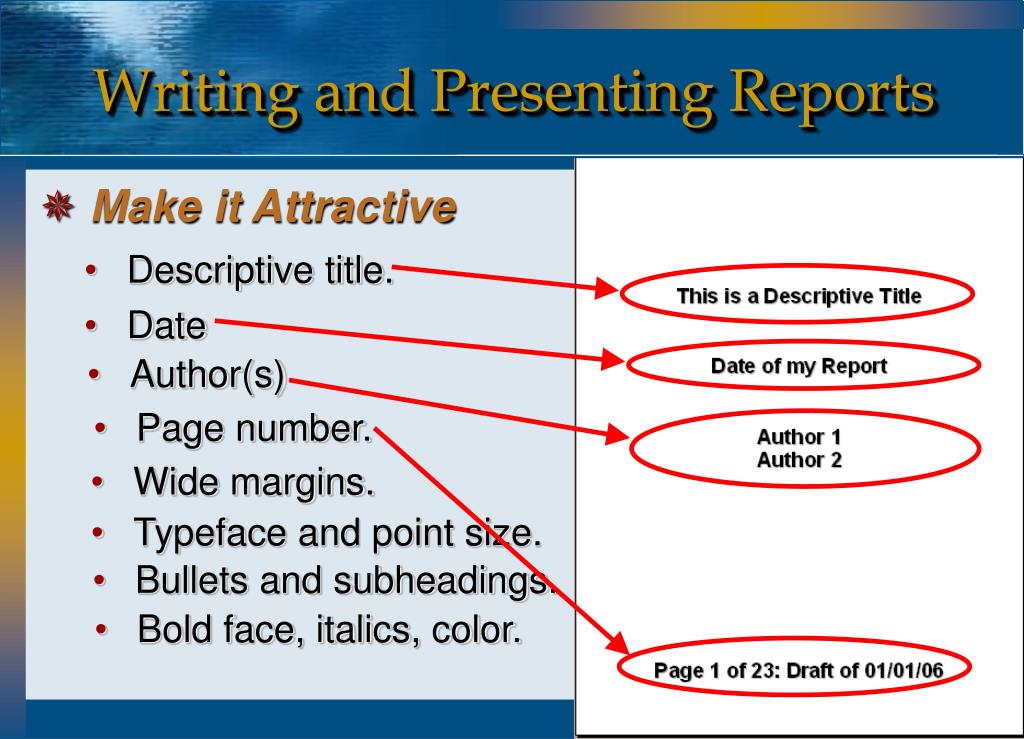 Writing and Presenting Reports • Make it Attractive • Descriptive title. • Date • Author(s) • Page number. • Wide margins. • Typeface and point size. • Bullets and subheadings. • Bold face, italics, color.