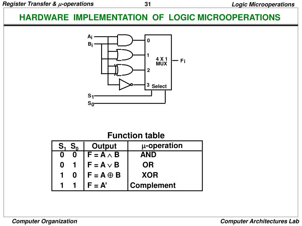 Logic Microoperations HARDWARE IMPLEMENTATION OF LOGIC MICROOPERATIONS A i 0 B i 1 4 X 1 F i MUX 2 3 Select S 1 S 0 Function table -operation S1 S0 Output 0 0 F = A B AND 0 1 F = AB OR 1 0 F = A B XOR 1 1 F = A’ Complement