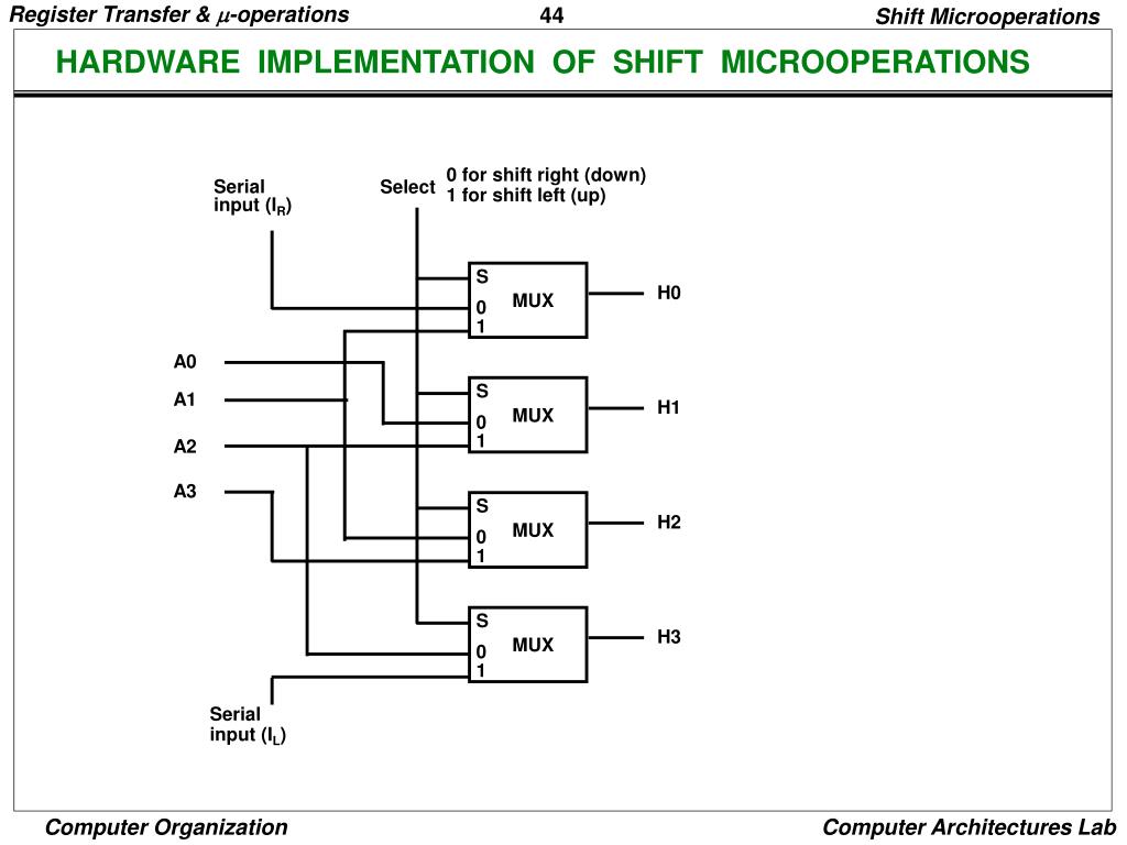 Shift Microoperations HARDWARE IMPLEMENTATION OF SHIFT MICROOPERATIONS 0 for shift right (down) 1 for shift left (up) Select Serial input (IR) S H0 MUX 0 1 A0 S A1 H1 MUX 0 1 A2 A3 S H2 MUX 0 1 S H3 MUX 0 1 Serial input (IL)