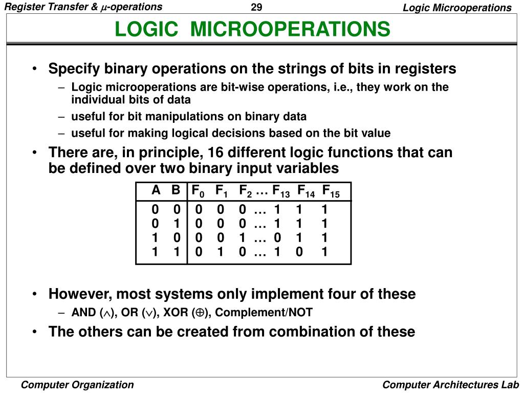 Specify binary operations on the strings of bits in registers Logic microoperations are bit-wise operations, i.e., they work on the individual bits of data useful for bit manipulations on binary data useful for making logical decisions based on the bit value There are, in principle, 16 different logic functions that can be defined over two binary input variables However, most systems only implement four of these AND (), OR (), XOR (), Complement/NOT The others can be created from combination of these Logic Microoperations A B F0 F1 F2 … F13 F14 F15 0 0 0 0 0 … 1 1 1 0 1 0 0 0 … 1 1 1 1 0 0 0 1 … 0 1 1 1 1 0 1 0 … 1 0 1 LOGIC MICROOPERATIONS