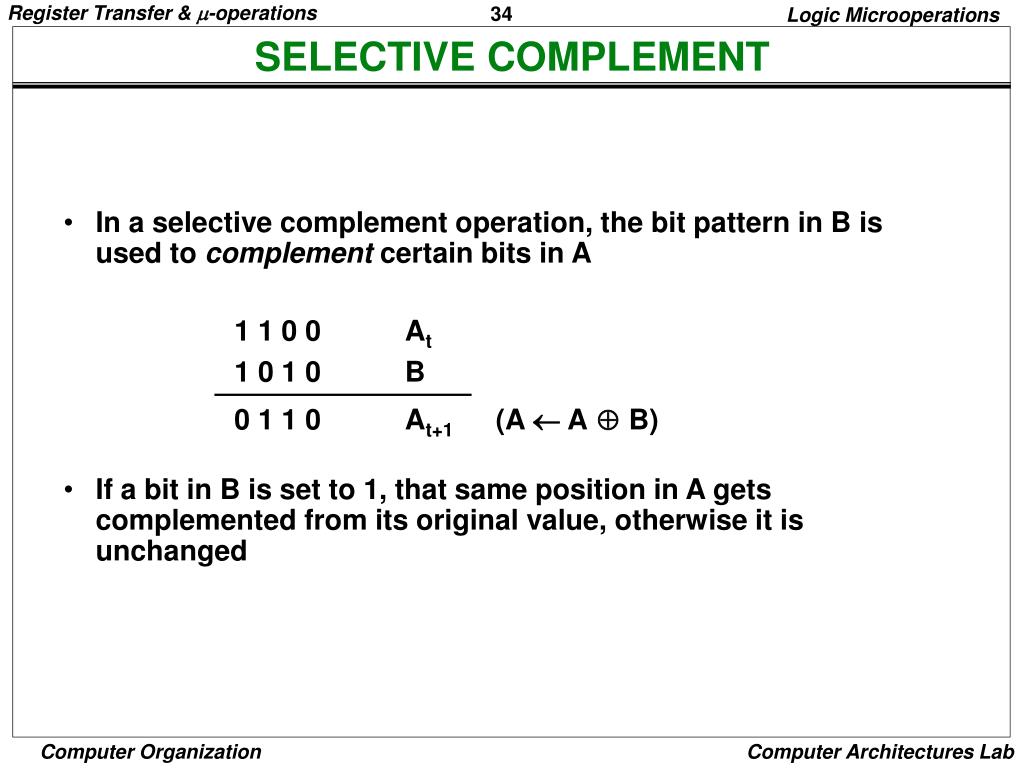 In a selective complement operation, the bit pattern in B is used to complement certain bits in A 1 1 0 0 At 1 0 1 0 B 0 1 1 0 At+1 (A AB) If a bit in B is set to 1, that same position in A gets complemented from its original value, otherwise it is unchanged Logic Microoperations SELECTIVE COMPLEMENT