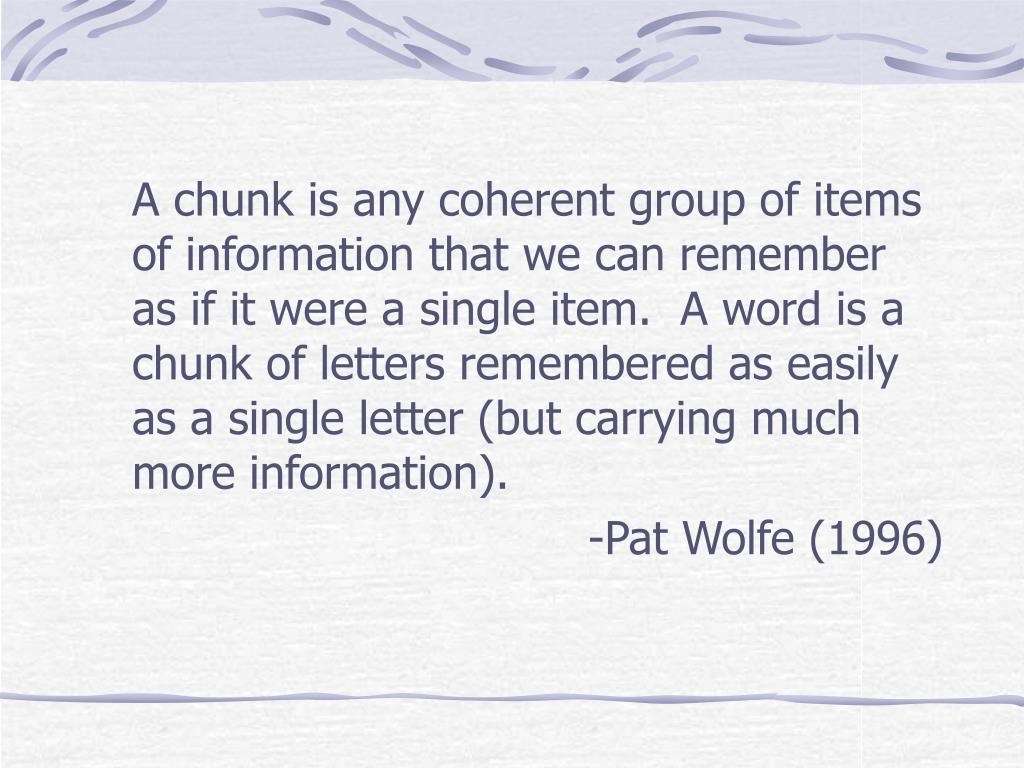 A chunk is any coherent group of items of information that we can remember as if it were a single item. A word is a chunk of letters remembered as easily as a single letter (but carrying much more information). -Pat Wolfe (1996)