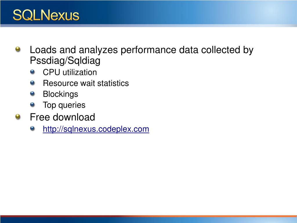SQLNexus • Loads and analyzes performance data collected by Pssdiag/Sqldiag • CPU utilization • Resource wait statistics • Blockings • Top queries • Free download • http://sqlnexus.codeplex.com