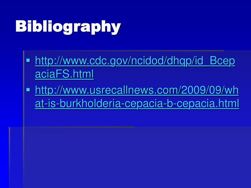 Bibliography • http://www.cdc.gov/ncidod/dhqp/id_BcepaciaFS.html • http://www.usrecallnews.com/2009/09/what-is-burkholderia-cepacia-b-cepacia.html