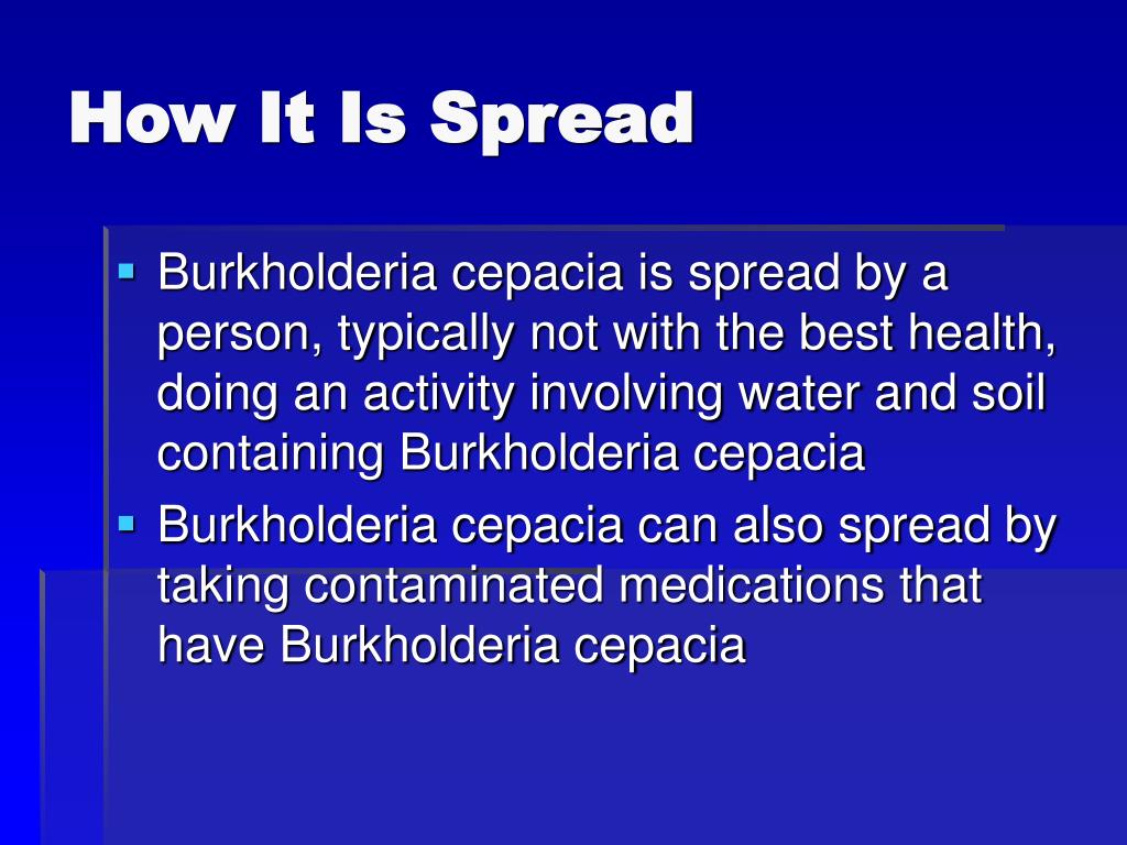 Burkholderia cepacia. By: matthew. How It Is Spread. Burkholderia cepacia is spread by a person, typically not with the best health, doing an activity involving water and soil containing Burkholderia cepacia