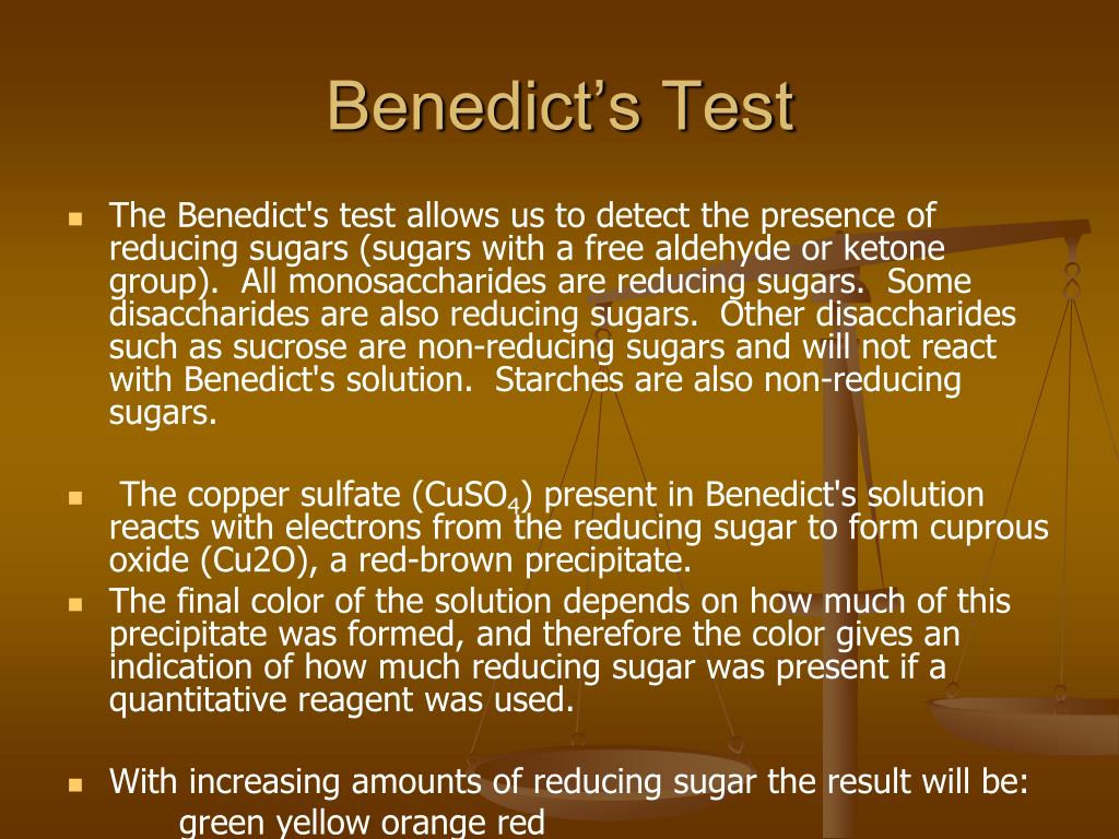 Benedict’s Test • The Benedict's test allows us to detect the presence of reducing sugars (sugars with a free aldehyde or ketone group). All monosaccharides are reducing sugars. Some disaccharides are also reducing sugars. Other disaccharides such as sucrose are non-reducing sugars and will not react with Benedict's solution. Starches are also non-reducing sugars. • The copper sulfate (CuSO4) present in Benedict's solution reacts with electrons from the reducing sugar to form cuprous oxide (Cu2O), a red-brown precipitate. • The final color of the solution depends on how much of this precipitate was formed, and therefore the color gives an indication of how much reducing sugar was present if a quantitative reagent was used. • With increasing amounts of reducing sugar the result will be: green yellow orange red