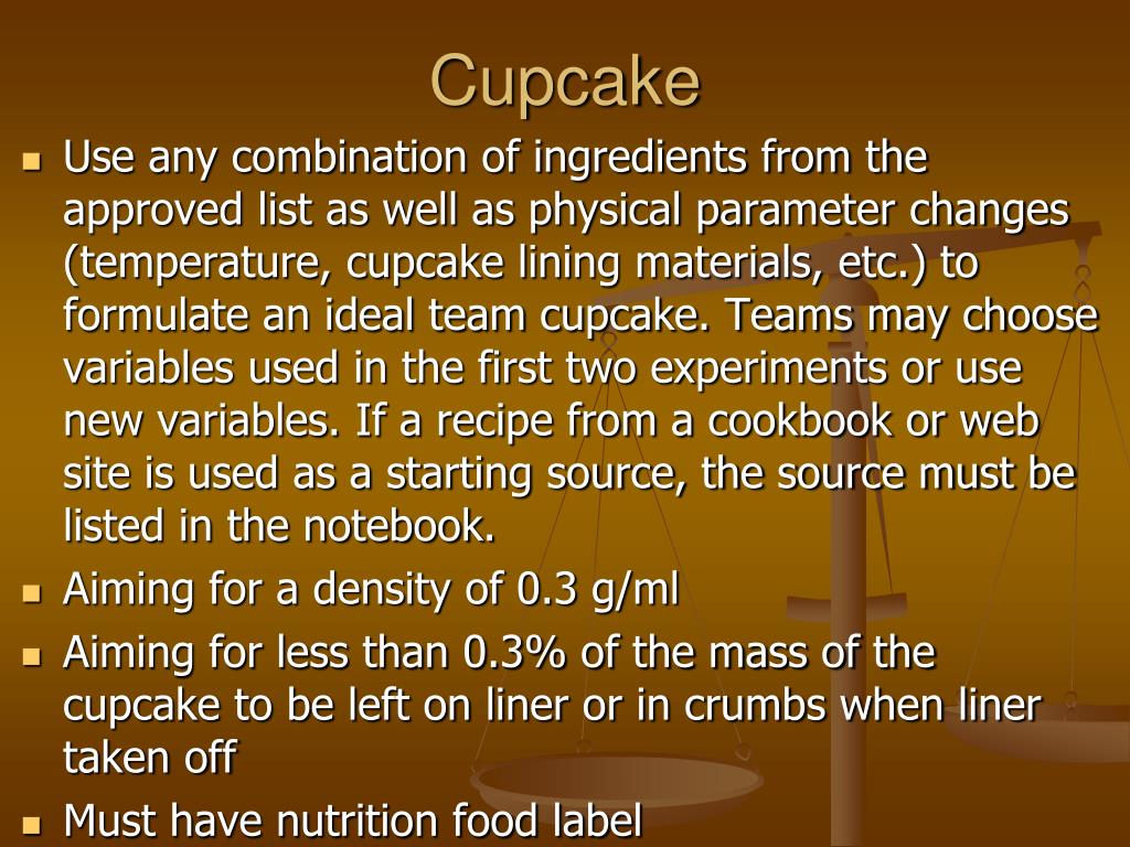 Cupcake • Use any combination of ingredients from the approved list as well as physical parameter changes (temperature, cupcake lining materials, etc.) to formulate an ideal team cupcake. Teams may choose variables used in the first two experiments or use new variables. If a recipe from a cookbook or web site is used as a starting source, the source must be listed in the notebook. • Aiming for a density of 0.3 g/ml • Aiming for less than 0.3% of the mass of the cupcake to be left on liner or in crumbs when liner taken off • Must have nutrition food label