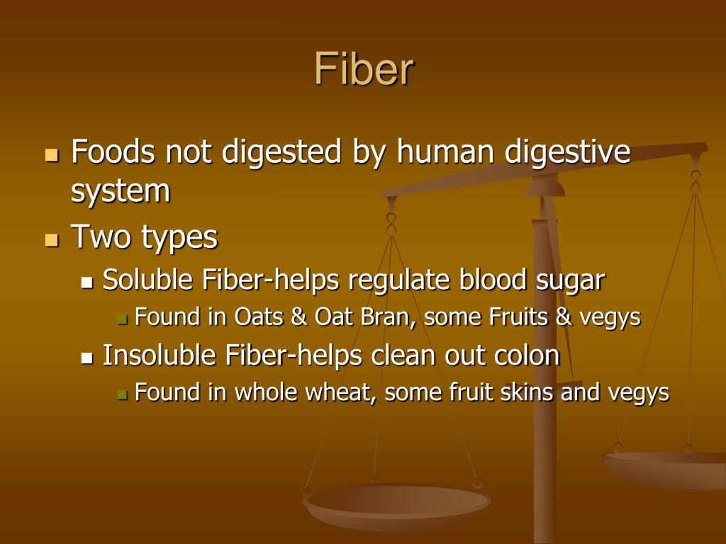 Fiber • Foods not digested by human digestive system • Two types • Soluble Fiber-helps regulate blood sugar • Found in Oats & Oat Bran, some Fruits & vegys • Insoluble Fiber-helps clean out colon • Found in whole wheat, some fruit skins and vegys