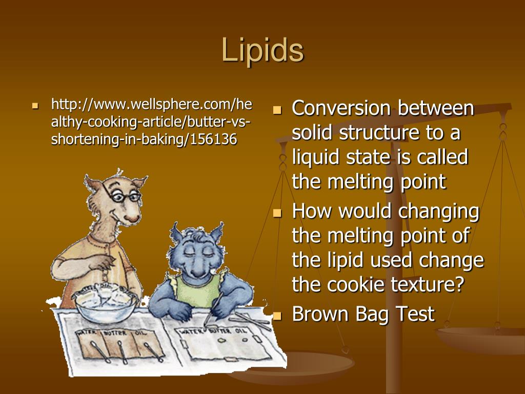 Lipids • http://www.wellsphere.com/healthy-cooking-article/butter-vs-shortening-in-baking/156136 • Conversion between solid structure to a liquid state is called the melting point • How would changing the melting point of the lipid used change the cookie texture? • Brown Bag Test