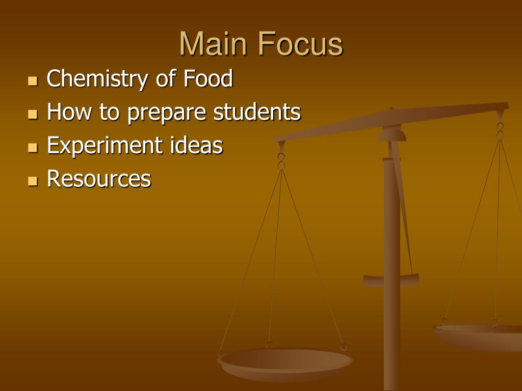 Main Focus • Chemistry of Food • How to prepare students • Experiment ideas • Resources