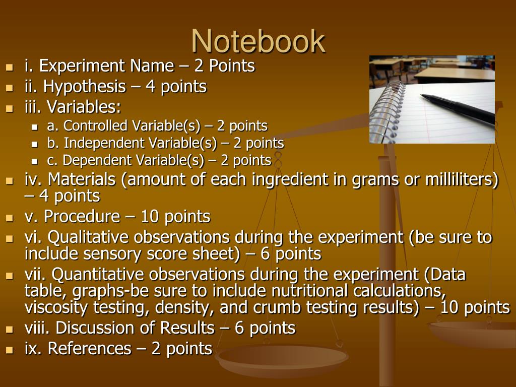 Notebook • i. Experiment Name – 2 Points • ii. Hypothesis – 4 points • iii. Variables: • a. Controlled Variable(s) – 2 points • b. Independent Variable(s) – 2 points • c. Dependent Variable(s) – 2 points • iv. Materials (amount of each ingredient in grams or milliliters) – 4 points • v. Procedure – 10 points • vi. Qualitative observations during the experiment (be sure to include sensory score sheet) – 6 points • vii. Quantitative observations during the experiment (Data table, graphs-be sure to include nutritional calculations, viscosity testing, density, and crumb testing results) – 10 points • viii. Discussion of Results – 6 points • ix. References – 2 points