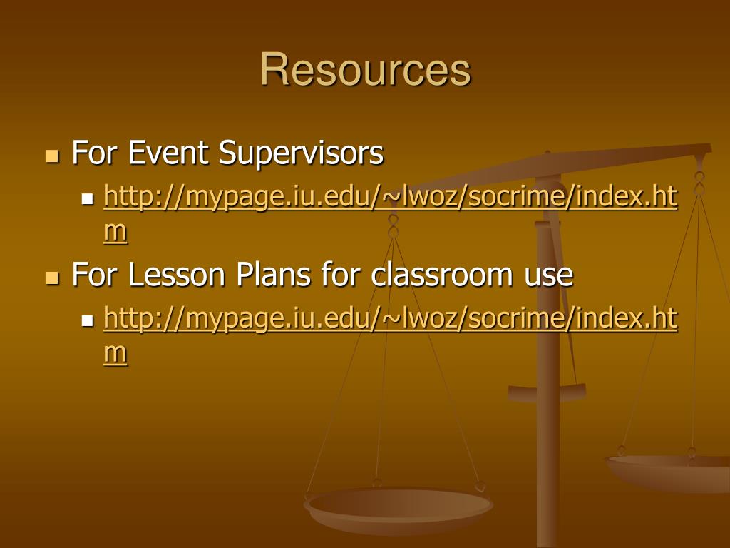 Resources • For Event Supervisors • http://mypage.iu.edu/~lwoz/socrime/index.htm • For Lesson Plans for classroom use • http://mypage.iu.edu/~lwoz/socrime/index.htm