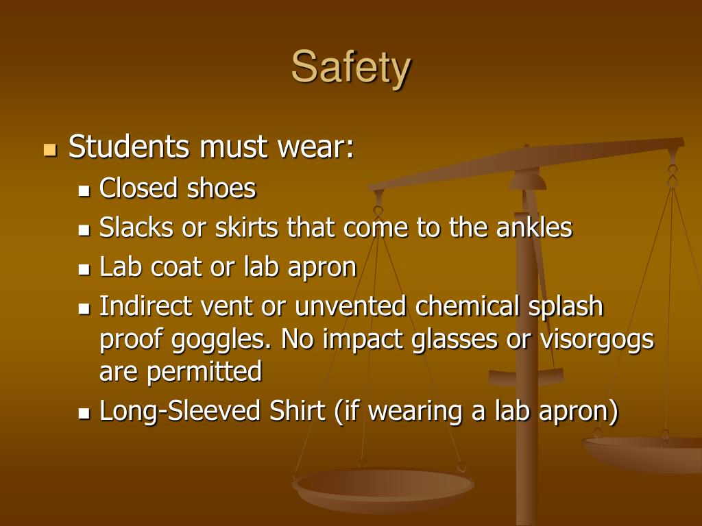 Safety • Students must wear: • Closed shoes • Slacks or skirts that come to the ankles • Lab coat or lab apron • Indirect vent or unvented chemical splash proof goggles. No impact glasses or visorgogs are permitted • Long-Sleeved Shirt (if wearing a lab apron)
