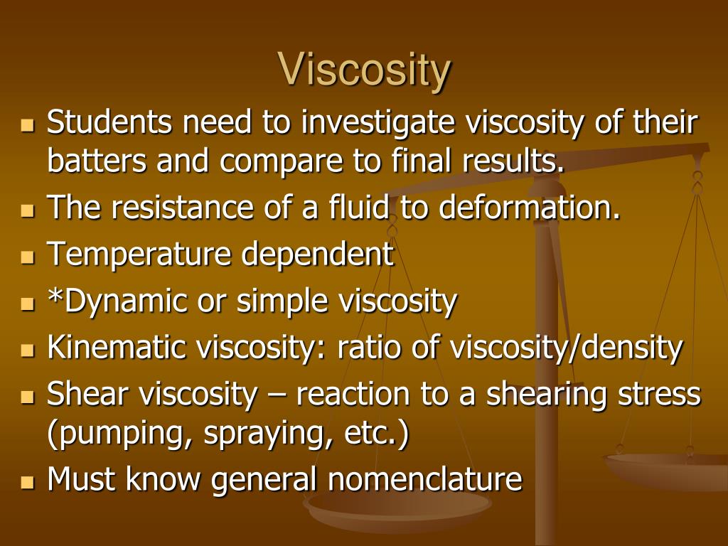 Viscosity • Students need to investigate viscosity of their batters and compare to final results. • The resistance of a fluid to deformation. • Temperature dependent • *Dynamic or simple viscosity • Kinematic viscosity: ratio of viscosity/density • Shear viscosity – reaction to a shearing stress (pumping, spraying, etc.) • Must know general nomenclature