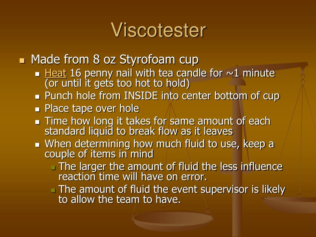 Viscotester • Made from 8 oz Styrofoam cup • Heat 16 penny nail with tea candle for ~1 minute (or until it gets too hot to hold) • Punch hole from INSIDE into center bottom of cup • Place tape over hole • Time how long it takes for same amount of each standard liquid to break flow as it leaves • When determining how much fluid to use, keep a couple of items in mind • The larger the amount of fluid the less influence reaction time will have on error. • The amount of fluid the event supervisor is likely to allow the team to have.