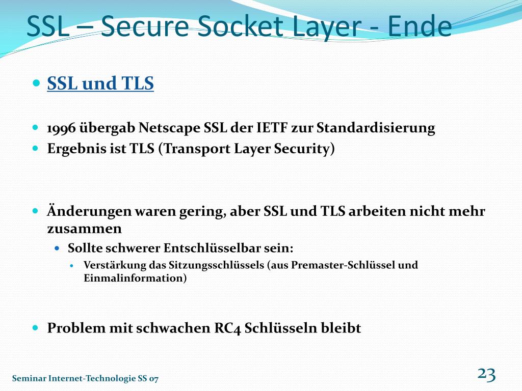 SSL – Secure Socket Layer - Ende • SSL und TLS • 1996 übergab Netscape SSL der IETF zur Standardisierung • Ergebnis ist TLS (Transport Layer Security) • Änderungen waren gering, aber SSL und TLS arbeiten nicht mehr zusammen • Sollte schwerer Entschlüsselbar sein: • Verstärkung das Sitzungsschlüssels (aus Premaster-Schlüssel und Einmalinformation) • Problem mit schwachen RC4 Schlüsseln bleibt Seminar Internet-Technologie SS 07
