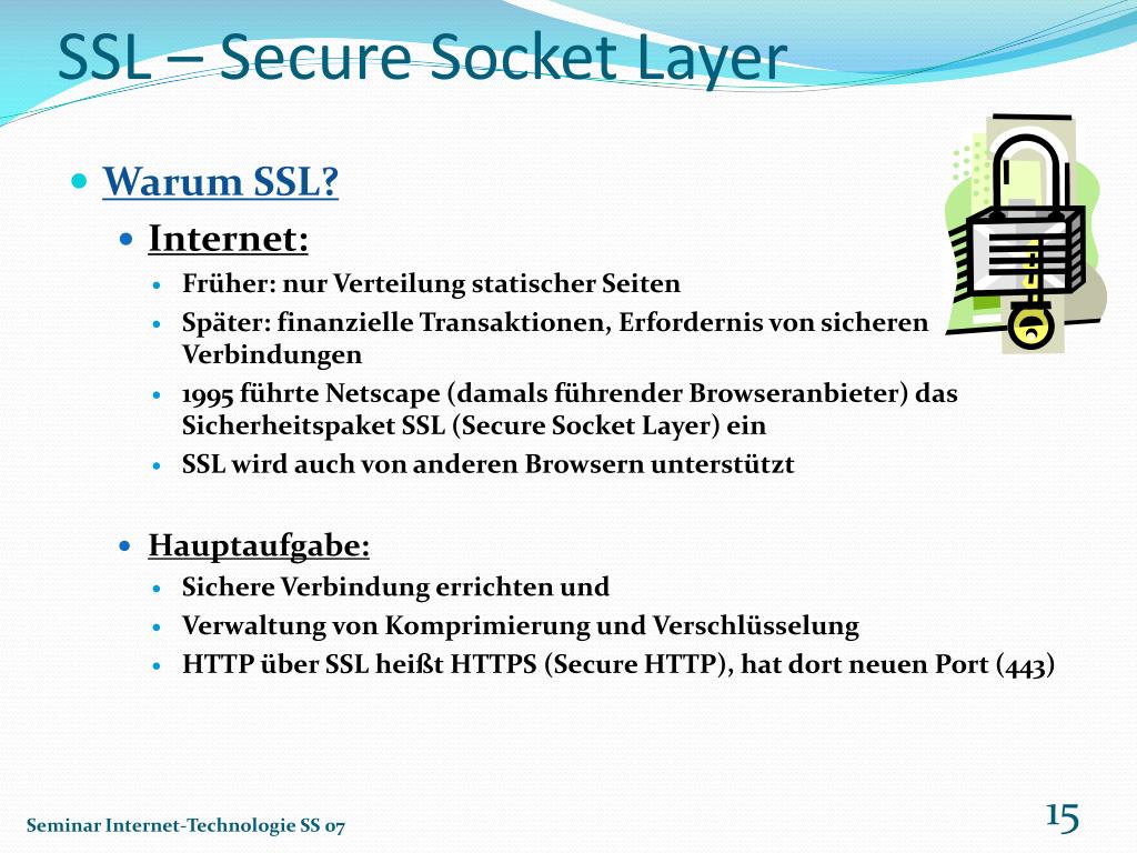 SSL – Secure Socket Layer • Warum SSL? • Internet: • Früher: nur Verteilung statischer Seiten • Später: finanzielle Transaktionen, Erfordernis von sicheren Verbindungen • 1995 führte Netscape (damals führender Browseranbieter) das Sicherheitspaket SSL (Secure Socket Layer) ein • SSL wird auch von anderen Browsern unterstützt • Hauptaufgabe: • Sichere Verbindung errichten und • Verwaltung von Komprimierung und Verschlüsselung • HTTP über SSL heißt HTTPS (Secure HTTP), hat dort neuen Port (443) Seminar Internet-Technologie SS 07