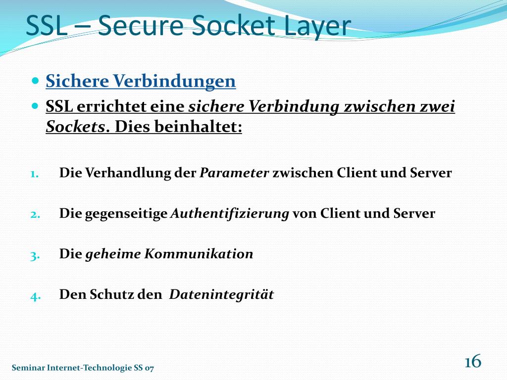 SSL – Secure Socket Layer • Sichere Verbindungen • SSL errichtet eine sichere Verbindungzwischen zwei Sockets. Dies beinhaltet: • Die Verhandlung der Parameter zwischen Client und Server • Die gegenseitige Authentifizierung von Client und Server • Die geheime Kommunikation • Den Schutz den Datenintegrität Seminar Internet-Technologie SS 07