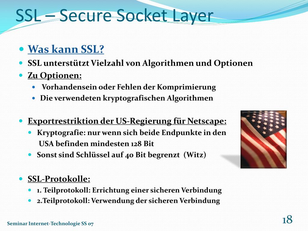 SSL – Secure Socket Layer • Was kann SSL? • SSL unterstützt Vielzahl von Algorithmen und Optionen • Zu Optionen: • Vorhandensein oder Fehlen der Komprimierung • Die verwendeten kryptografischen Algorithmen • Exportrestriktion der US-Regierung für Netscape: • Kryptografie: nur wenn sich beide Endpunkte in den USA befinden mindesten 128 Bit • Sonst sind Schlüssel auf 40 Bit begrenzt (Witz) • SSL-Protokolle: • 1. Teilprotokoll: Errichtung einer sicheren Verbindung • 2.Teilprotokoll: Verwendung der sicheren Verbindung Seminar Internet-Technologie SS 07