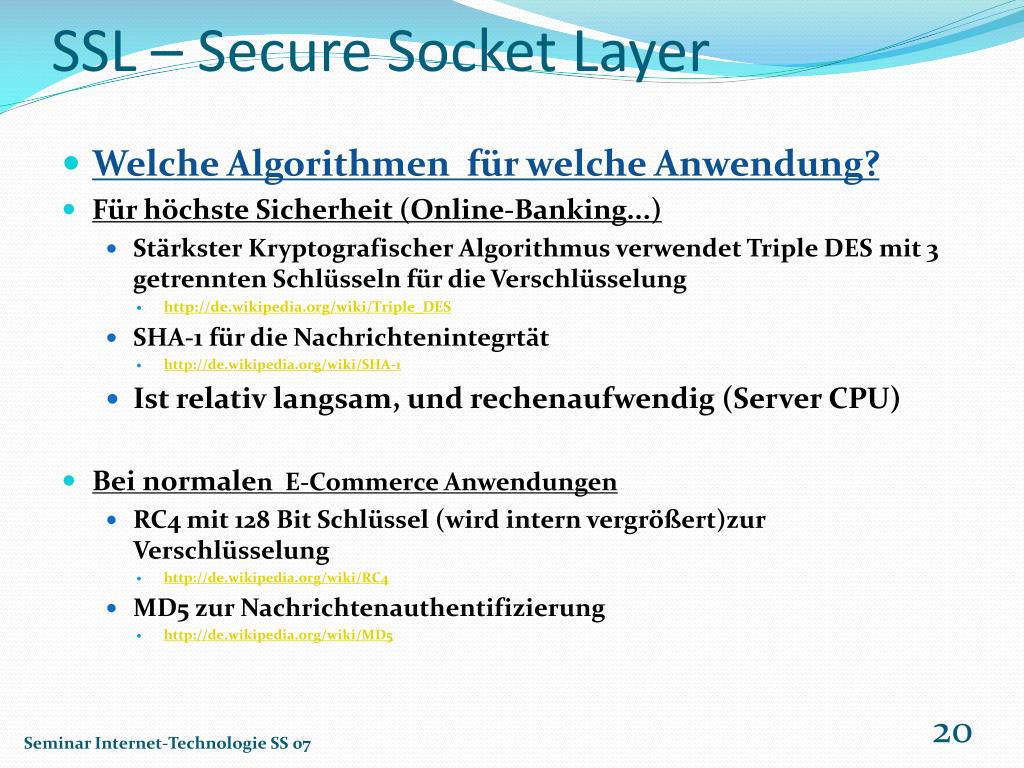 SSL – Secure Socket Layer • Welche Algorithmen für welche Anwendung? • Für höchste Sicherheit (Online-Banking...) • Stärkster Kryptografischer Algorithmus verwendet Triple DES mit 3 getrennten Schlüsseln für die Verschlüsselung • http://de.wikipedia.org/wiki/Triple_DES • SHA-1 für die Nachrichtenintegrtät • http://de.wikipedia.org/wiki/SHA-1 • Ist relativ langsam, und rechenaufwendig (Server CPU) • Bei normalen E-Commerce Anwendungen • RC4 mit 128 Bit Schlüssel (wird intern vergrößert)zur Verschlüsselung • http://de.wikipedia.org/wiki/RC4 • MD5 zur Nachrichtenauthentifizierung • http://de.wikipedia.org/wiki/MD5 Seminar Internet-Technologie SS 07