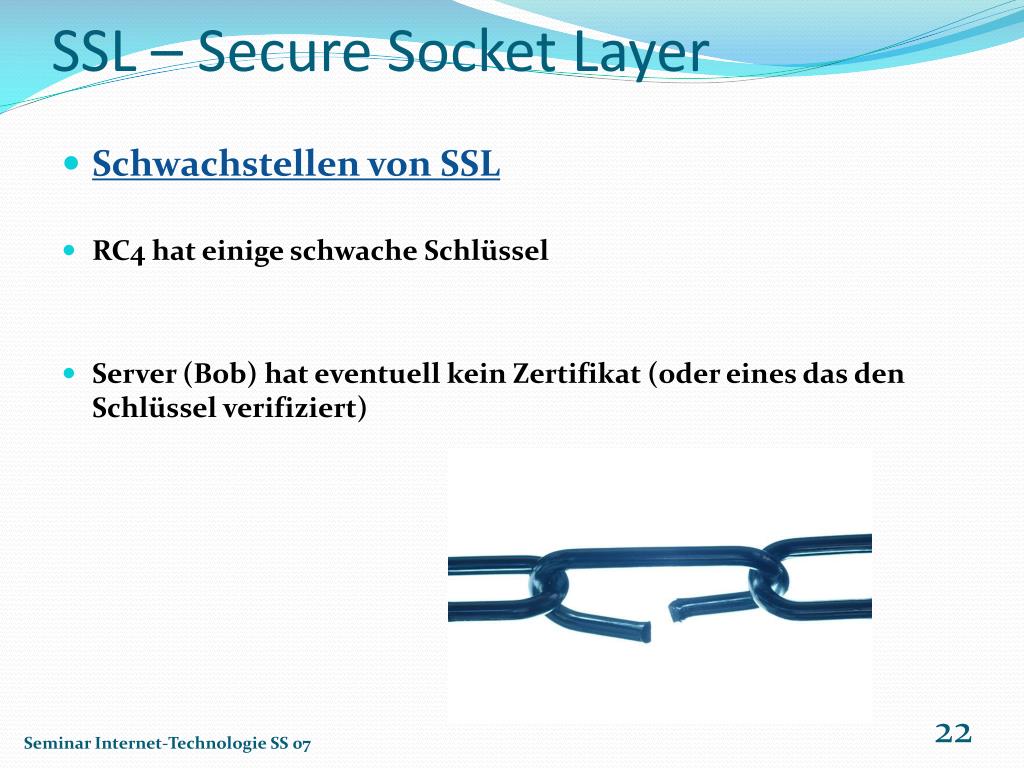 SSL – Secure Socket Layer • Schwachstellen von SSL • RC4 hat einige schwache Schlüssel • Server (Bob) hat eventuell kein Zertifikat (oder eines das den Schlüssel verifiziert) Seminar Internet-Technologie SS 07