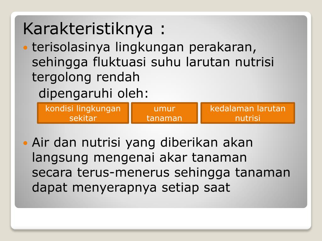 Karakteristiknya : • terisolasinya lingkungan perakaran, sehingga fluktuasi suhu larutan nutrisi tergolong rendah dipengaruhi oleh: • Air dannutrisi yang diberikanakanlangsungmengenaiakartanamansecaraterus-menerussehinggatanamandapatmenyerapnyasetiapsaat kondisi lingkungan sekitar umur tanaman kedalaman larutan nutrisi