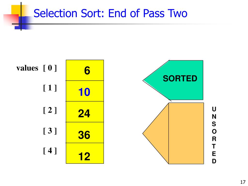 SORTED Selection Sort: End of Pass Two values [ 0 ] [ 1 ] [ 2 ] [ 3 ] [ 4 ] 6 10 24 36 12 U N S O R T E D 17