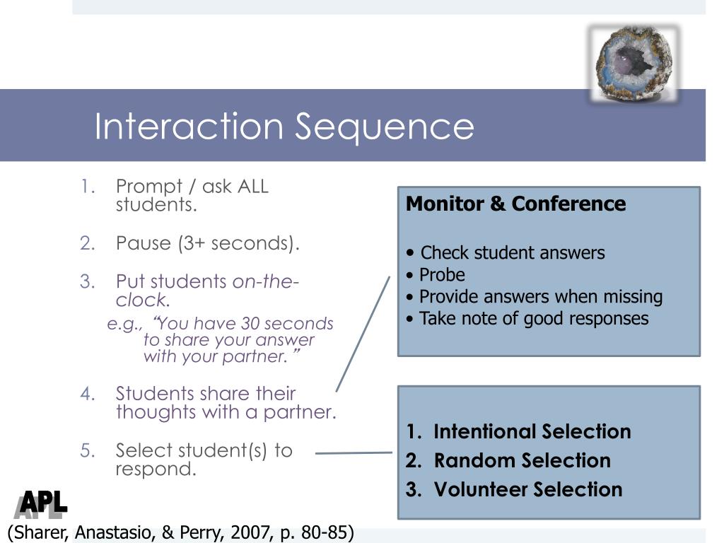 Prompt / ask ALL students. Pause (3+ seconds). Put students on-the-clock. e.g., “You have 30 seconds to share your answer with your partner.” Students share their thoughts with a partner. Select student(s) to respond. APL (Sharer, Anastasio, & Perry, 2007, p. 80-85) Interaction Sequence • Monitor & Conference • Check student answers • Probe • Provide answers when missing • Take note of good responses 1. Intentional Selection 2. Random Selection 3. Volunteer Selection