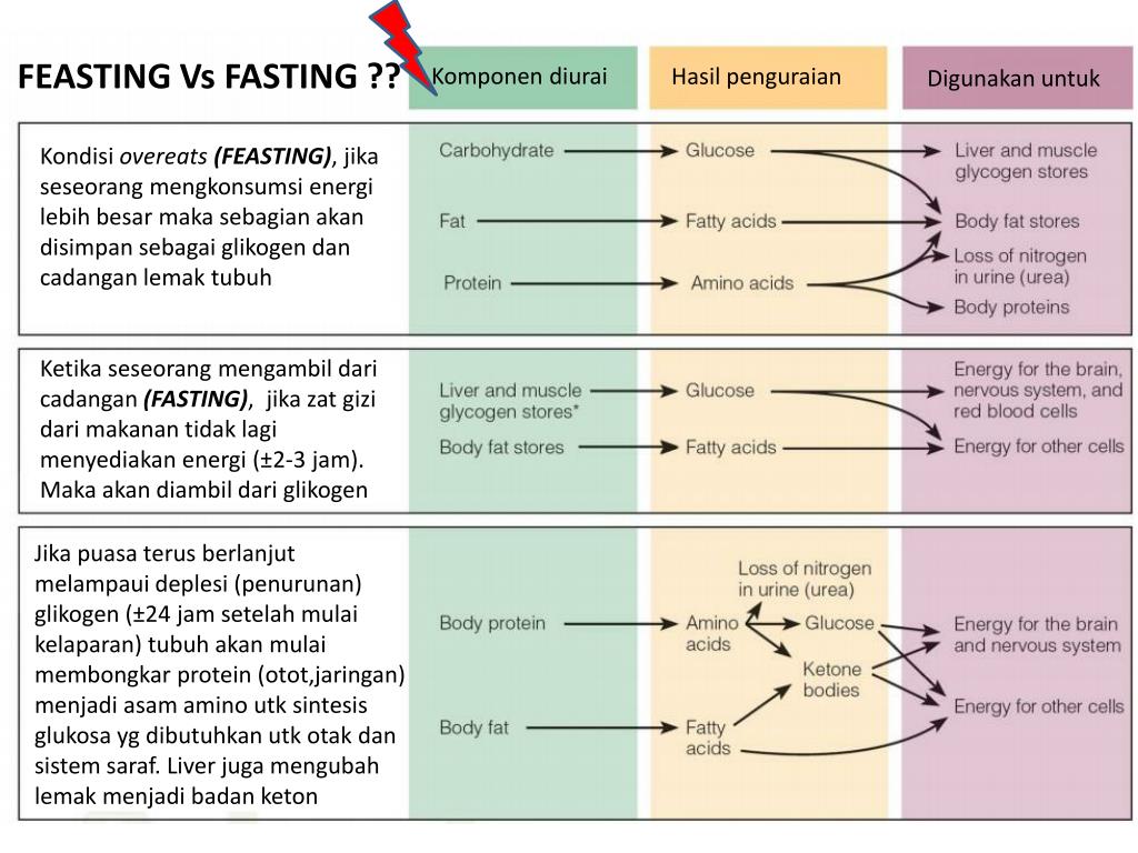 FEASTING Vs FASTING ?? Komponen diurai Hasil penguraian Digunakan untuk Kondisi overeats (FEASTING), jika seseorang mengkonsumsi energi lebih besar maka sebagian akan disimpan sebagai glikogen dan cadangan lemak tubuh Ketika seseorang mengambil dari cadangan (FASTING), jika zat gizi dari makanan tidak lagi menyediakan energi (±2-3 jam). Maka akan diambil dari glikogen Jika puasa terus berlanjut melampaui deplesi (penurunan) glikogen (±24 jam setelah mulai kelaparan) tubuh akan mulai membongkar protein (otot,jaringan) menjadi asam amino utk sintesis glukosa yg dibutuhkan utk otak dan sistem saraf. Liver juga mengubah lemak menjadi badan keton