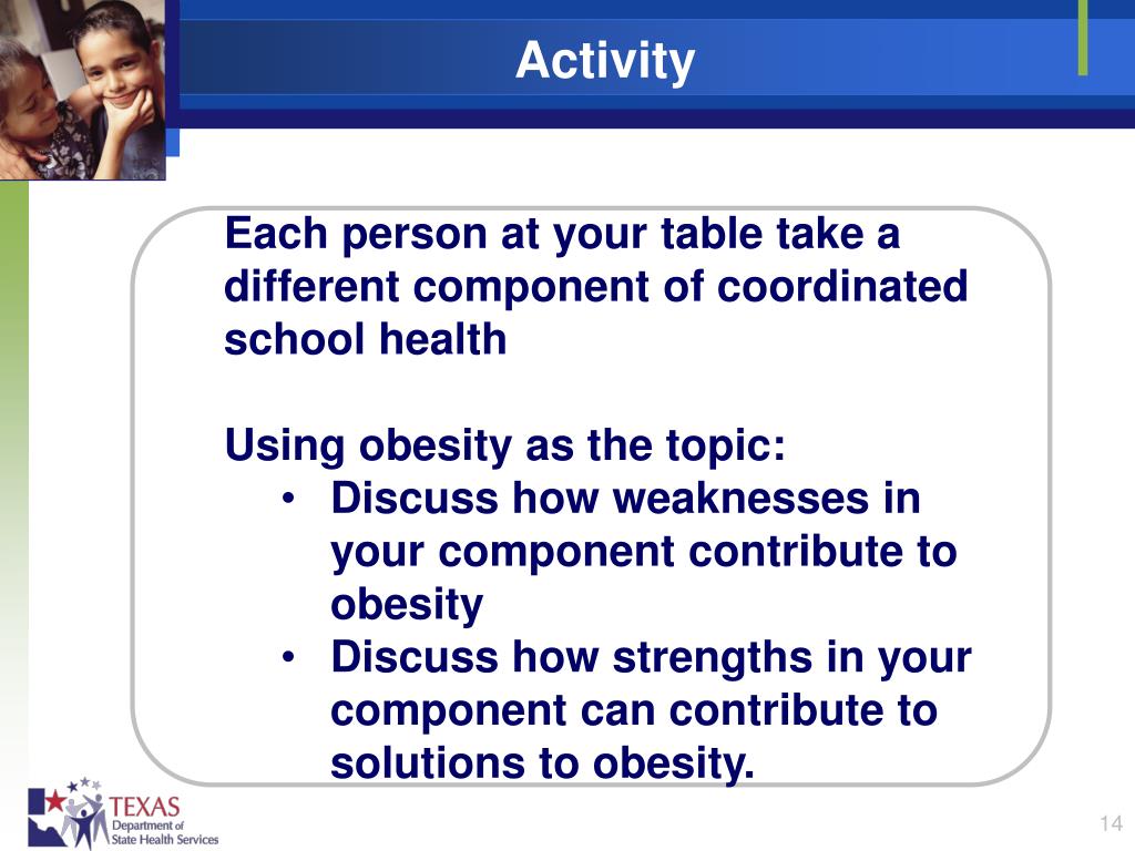 Activity • Each person at your table take a different component of coordinated school health • Using obesity as the topic: • Discuss how weaknesses in your component contribute to obesity • Discuss how strengths in your component can contribute to solutions to obesity.
